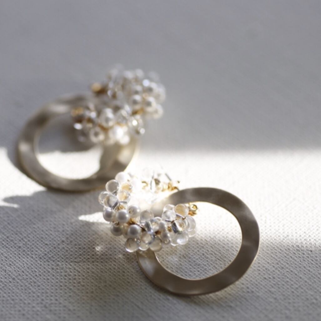 クリア&パールでまとめたフープピアスに、ゴールドの大振りリングを合わせたピアス。