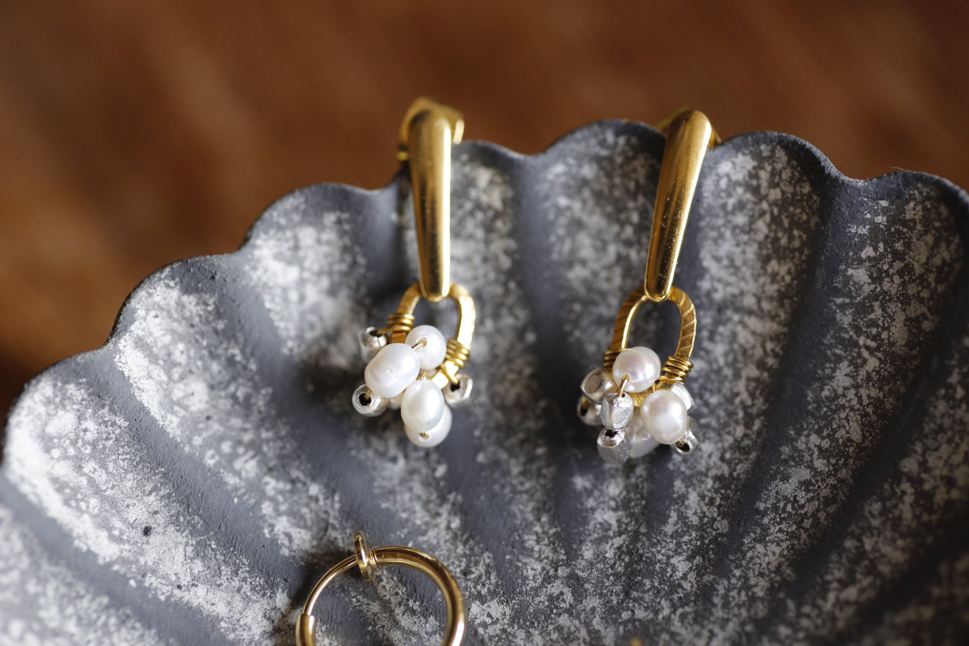 一つ一つ個性を持っている淡水パールをアンティーク調のメタルでまとめたモチーフは、小ぶりでありながら存在感があります。
