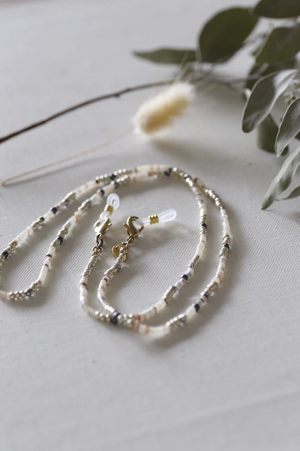 サンゴビーズとメタルビーズを繋げたシンプルなマスクコード。