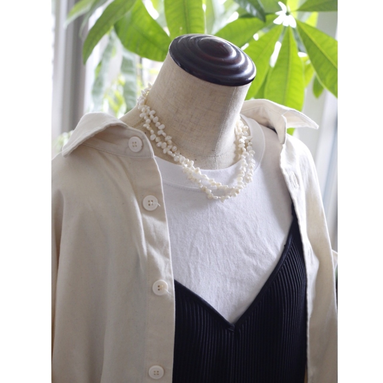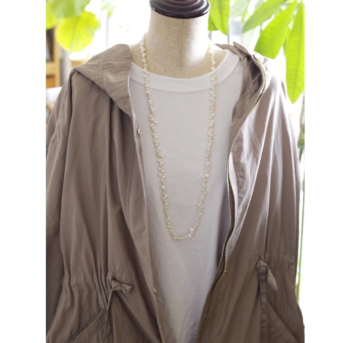 パール部分は約80cmあるので、1連でも2連でもお使いいただける長さになっています。シンプルなコーディネートにさらりとつけるだけで、キレイめカジュアルスタイルに!!オケージョンシーンでも活躍してくれる万能ネックレスです。