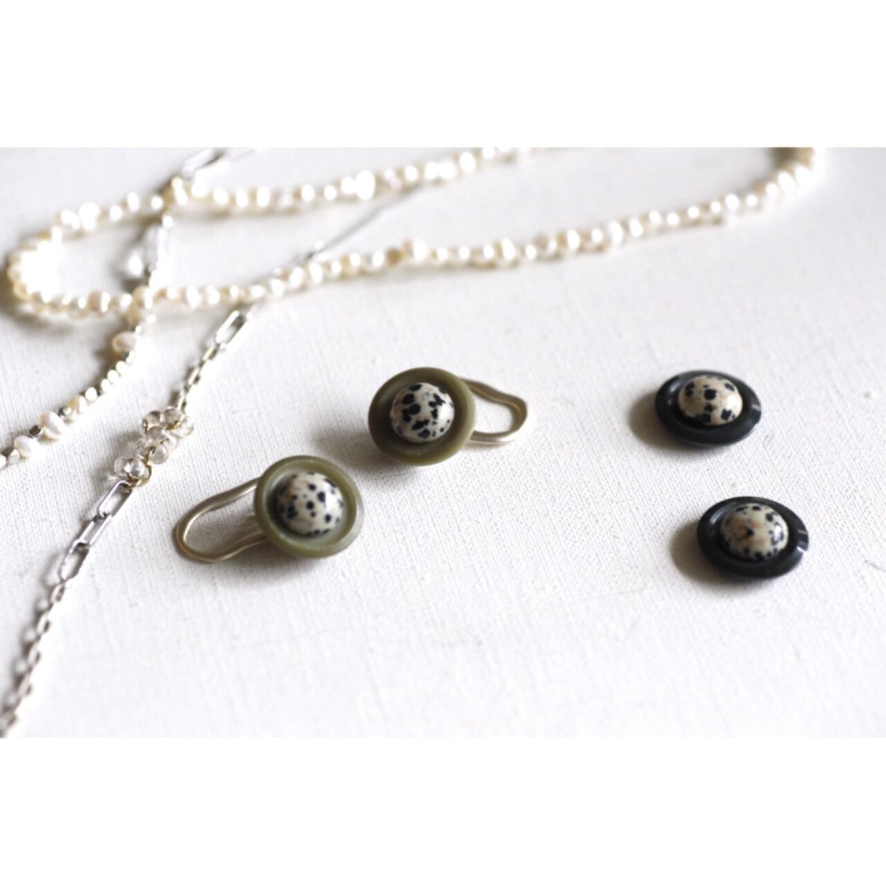 nat*ty ヴィンテージボタンのダルメシアンジャスパーイヤリング ラウンドダークグリーン