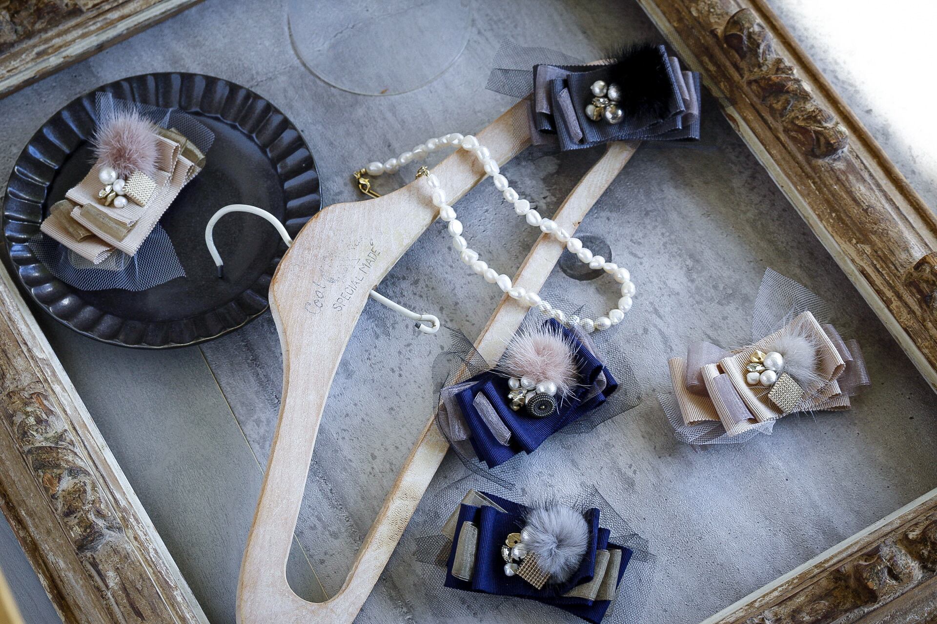 ビジュー部分は、ミンクファー、コットンパール、淡水パール、ラインストーン、ボタンなどをあしらい、カジュアルでありながら、大人っぽく落ち着いた雰囲気に仕上げています。