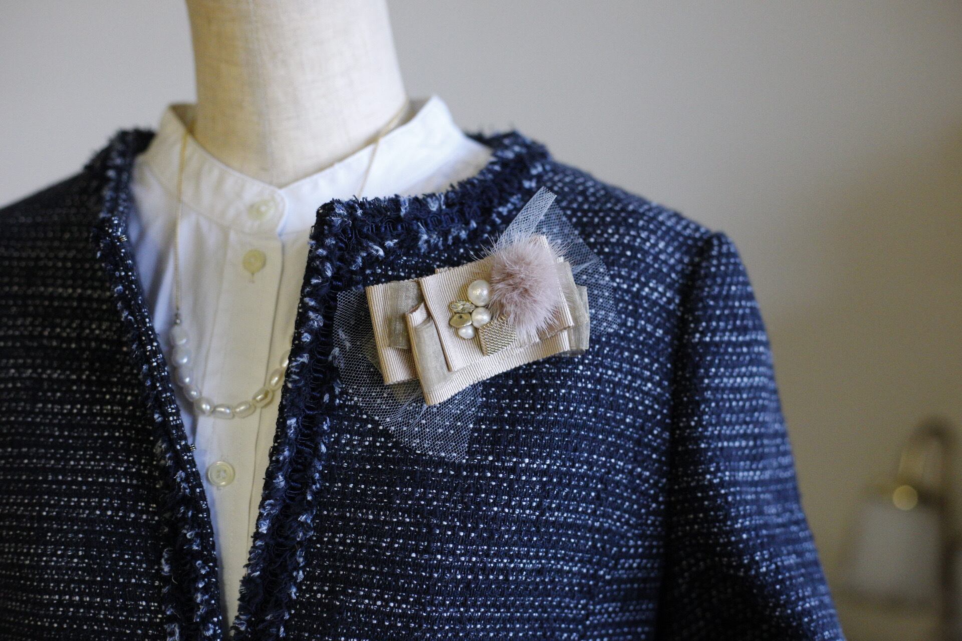 紺系、黒系のジャケットに合わせると、よりコサージュが際立ち存在感が増します。