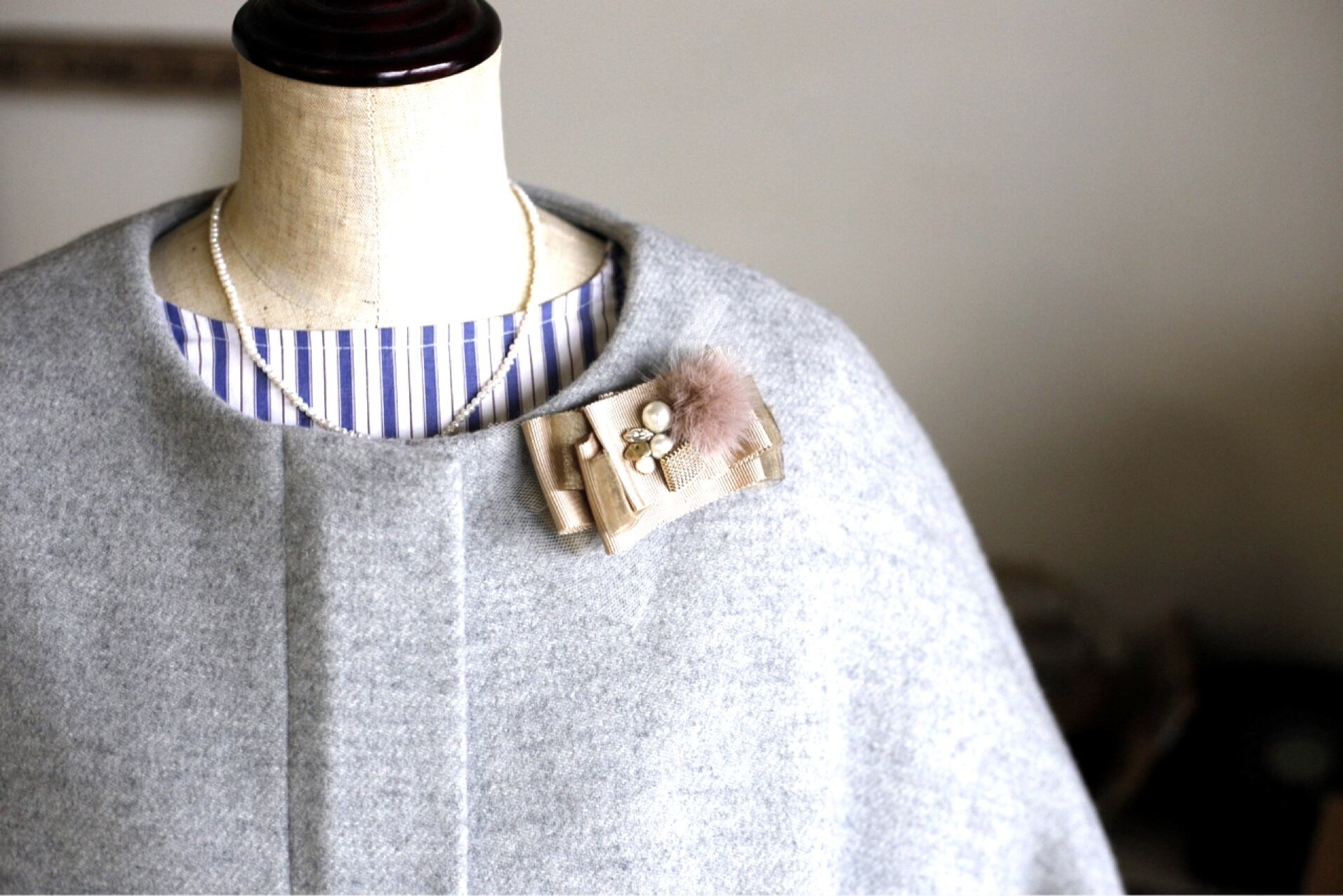 つけるだけでスタイリッシュに決まる、一点物のリボンコサージュ、おすすめです。