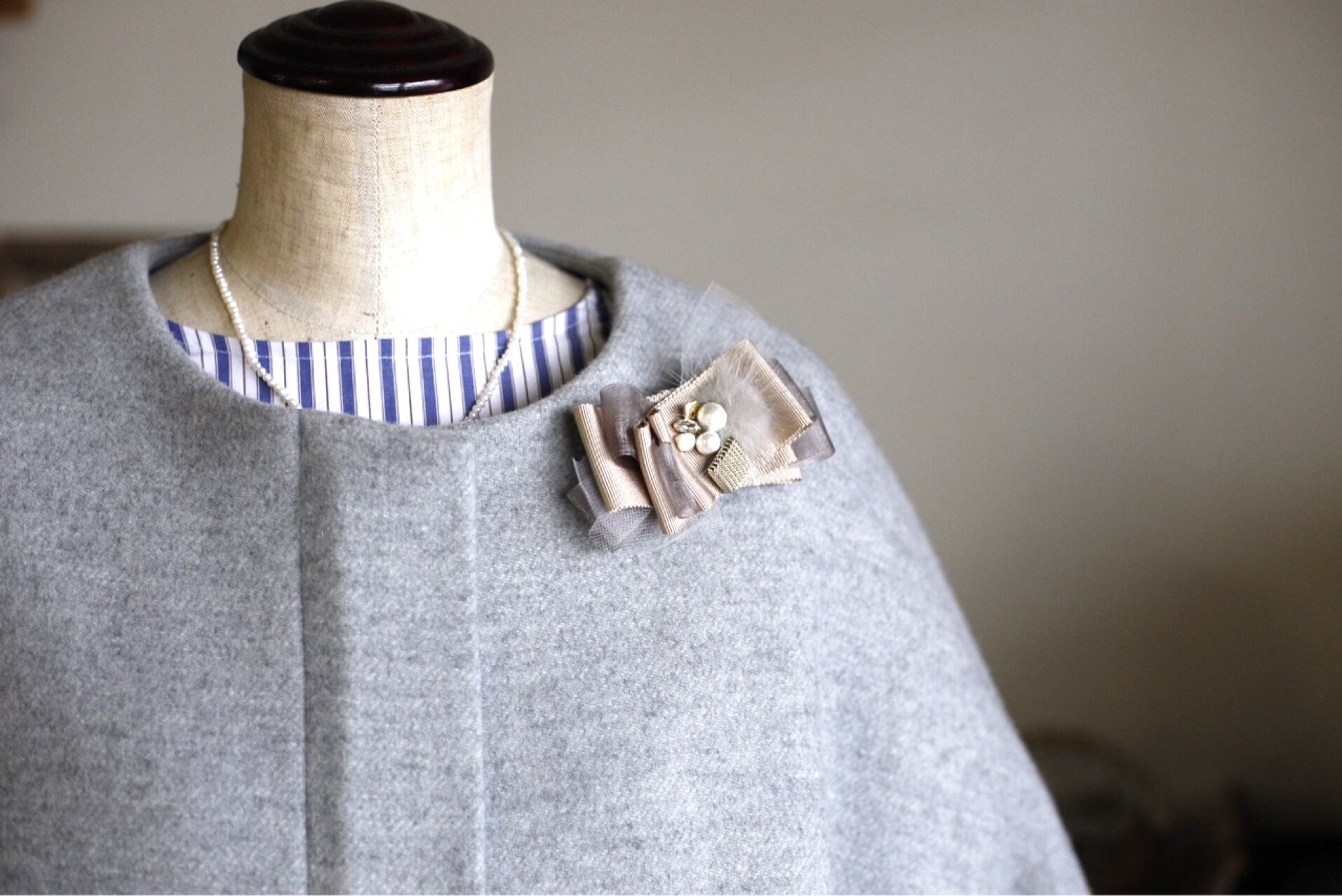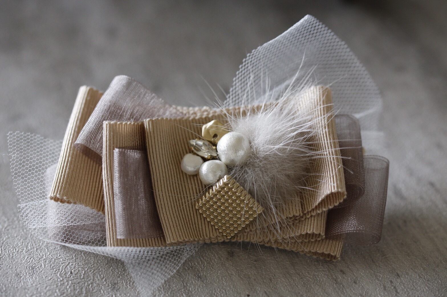ベージュのグログランリボン、シルバーグレーのオーガンジーリボンをベースにした、カジュアルなコサージュ!
