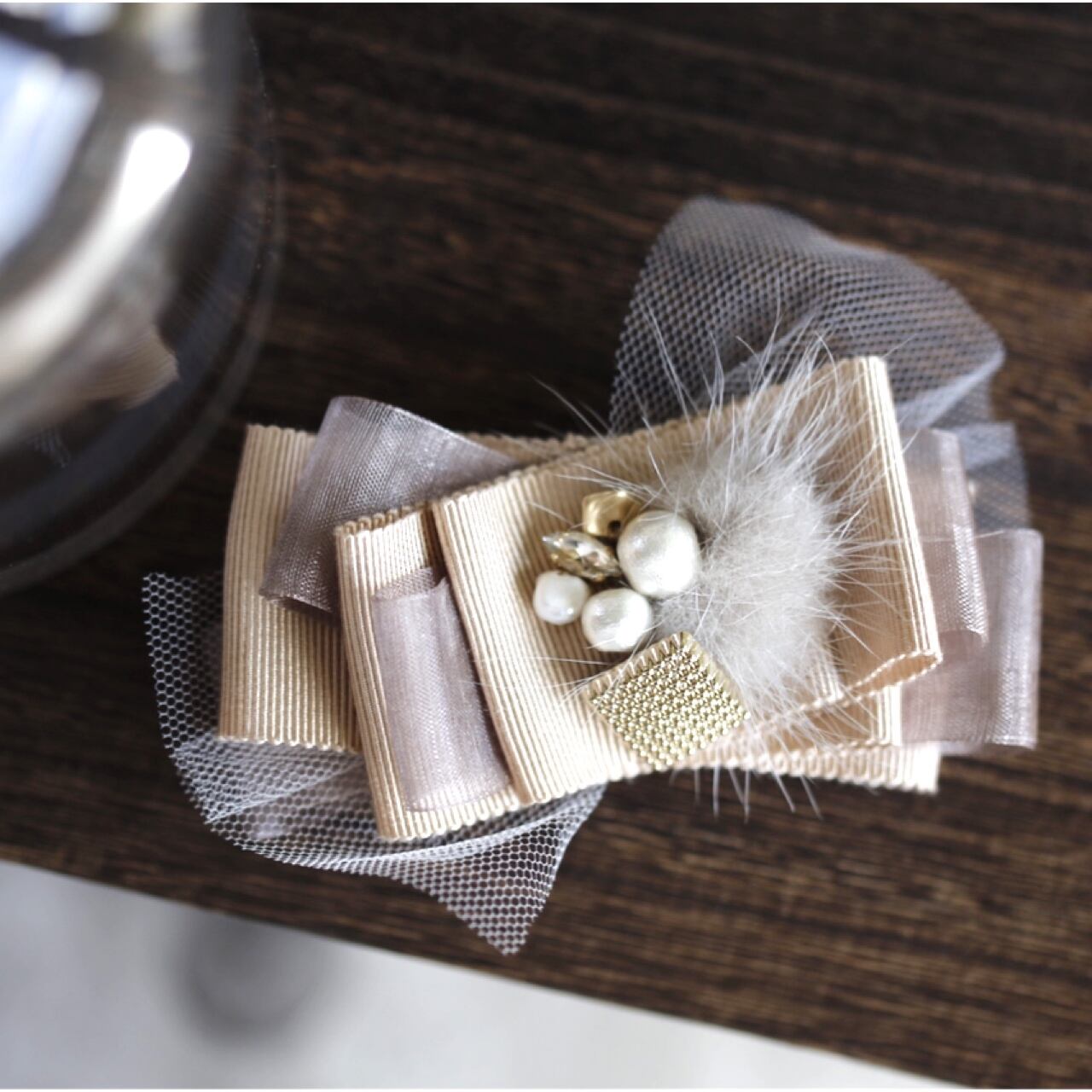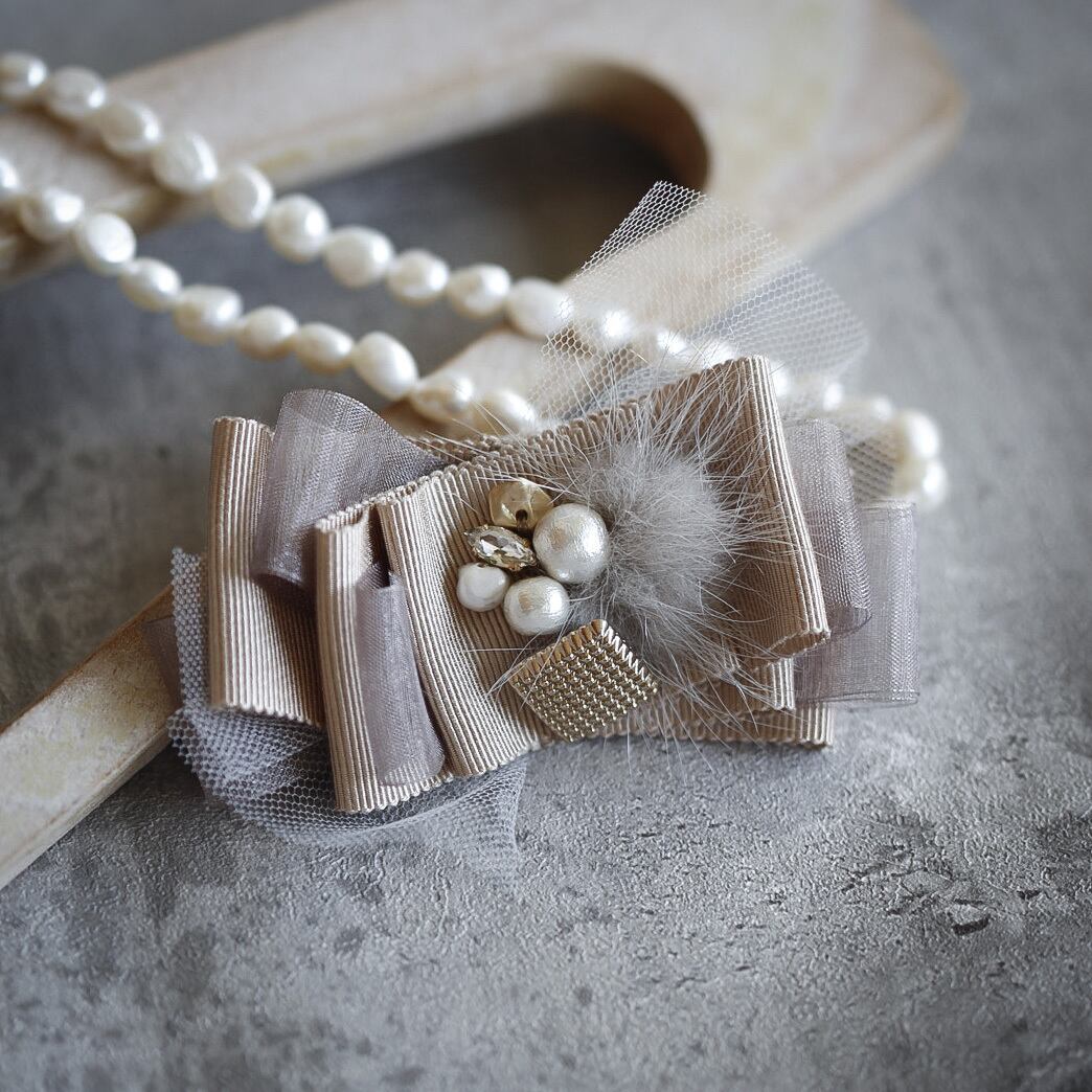 グログランリボン、オーガンジーリボン、チュール、ミンクファー、コットンパール、淡水パール、ラインストーン、ボタン
