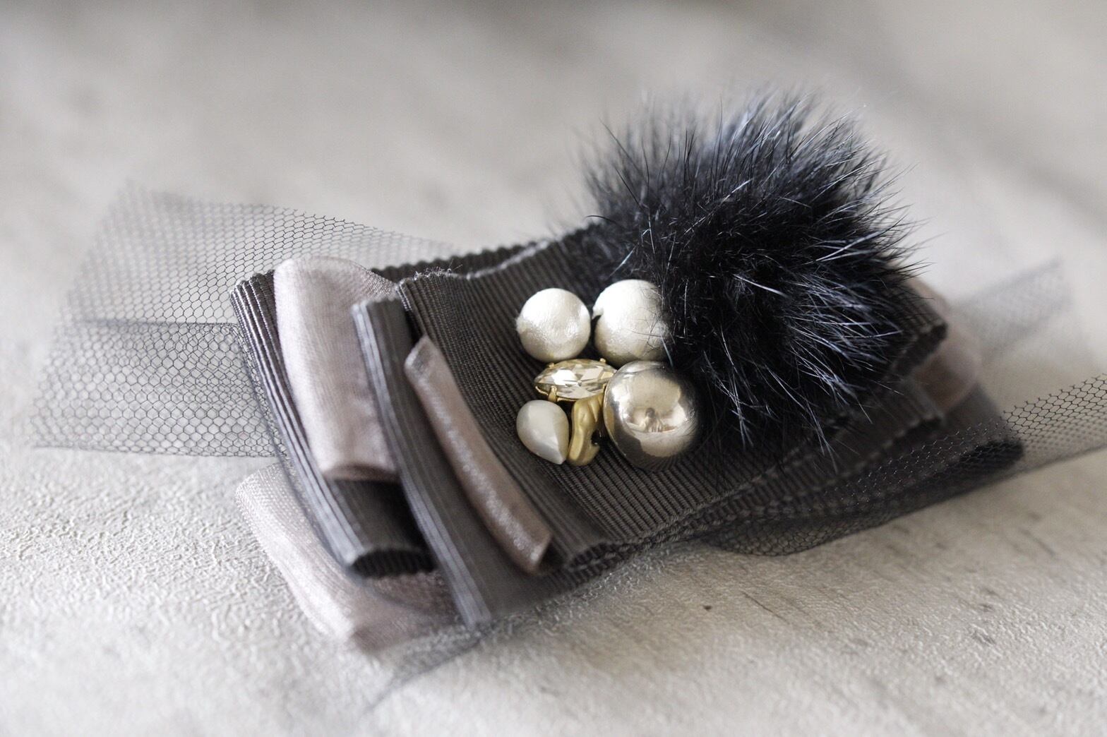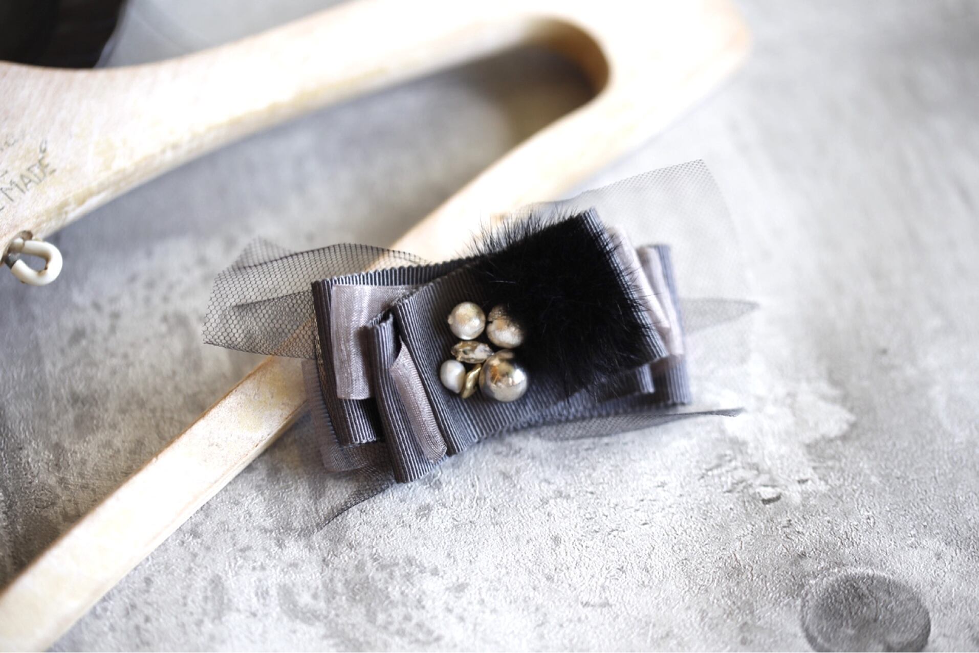 グレーのグログランリボン、シルバーグレーのオーガンジーリボンをベースにした、カジュアルなコサージュ!
