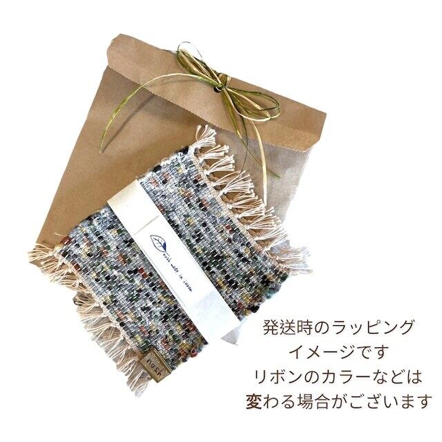 縦糸は生成り、裂いた生地はブラックを基調とした綿素材の裂いた生地を使い、ひと織りひと織り丁寧に織り上げた裂織りフリンジコースターです。