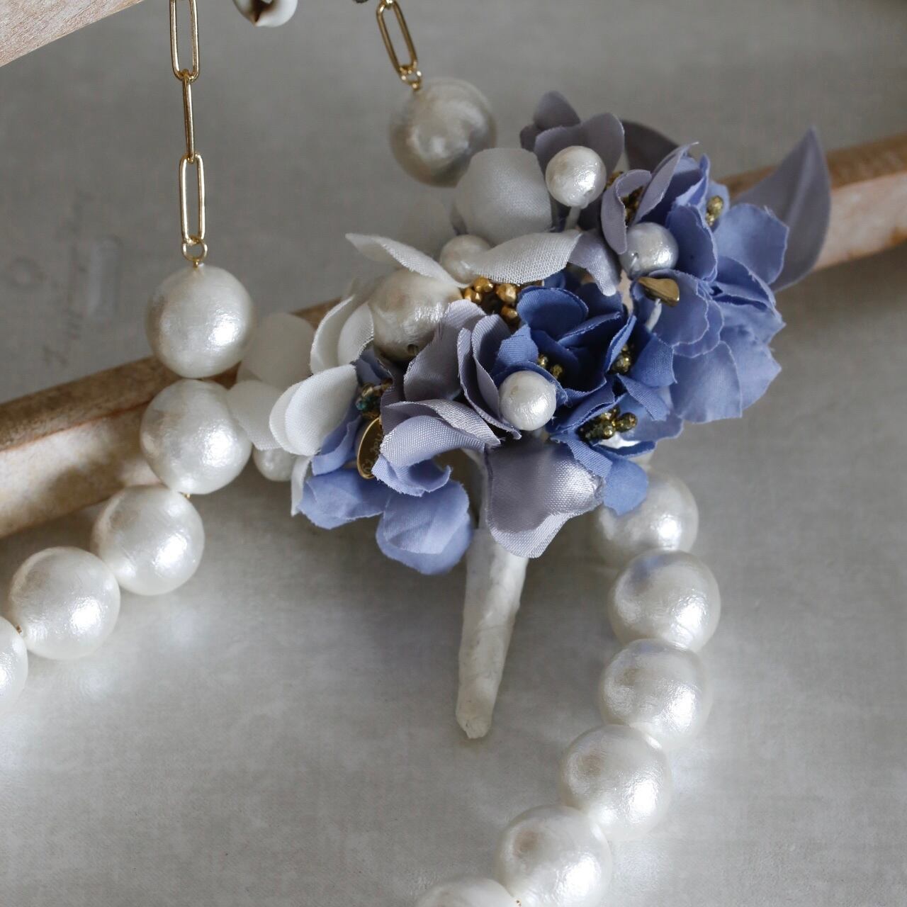 花びらパーツをグラデーションで組むことにより、どんなカラーの洋服や素材にも馴染みます。ビーズパーツを入れることにより、パールアクセサリーとの相性も抜群です。