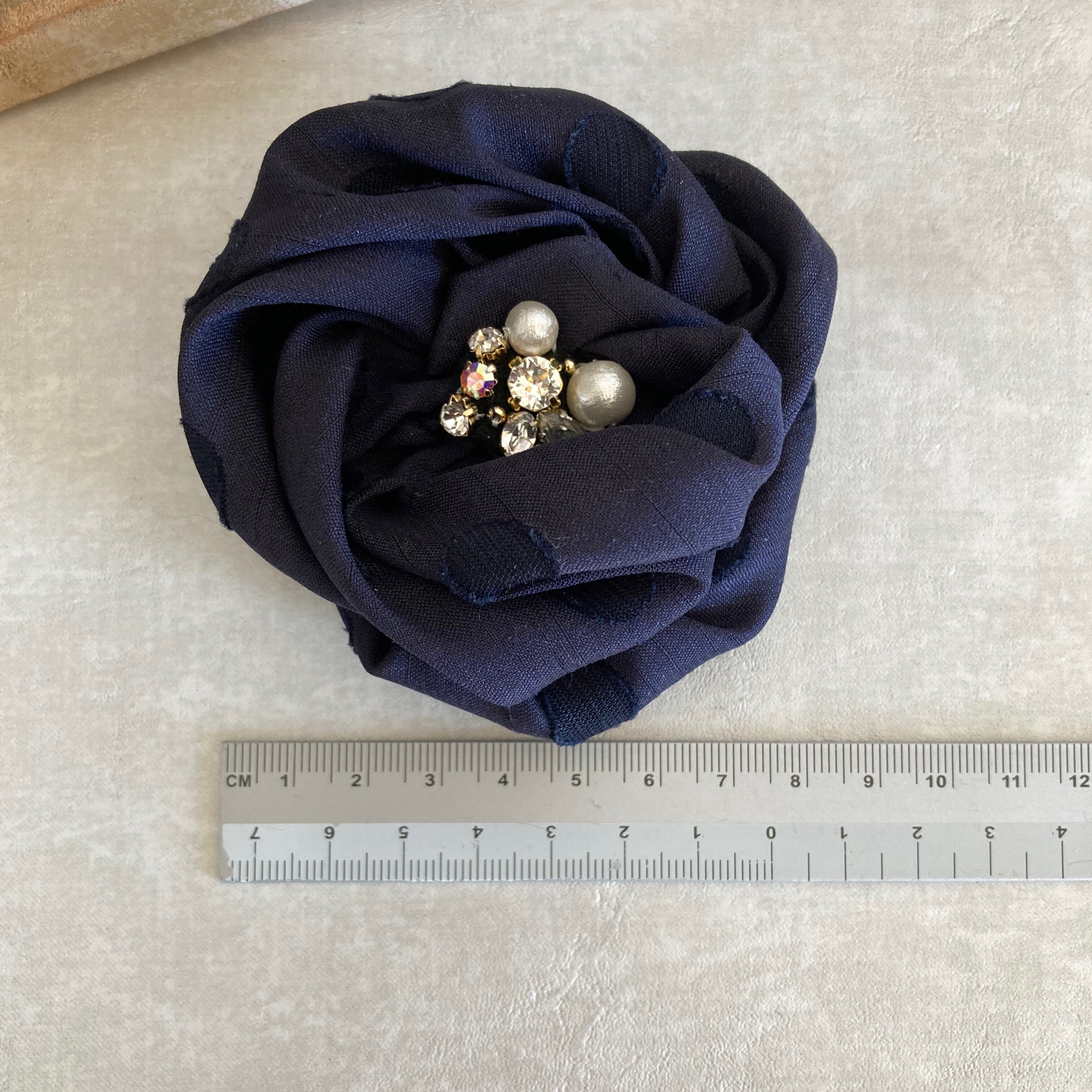 ドット柄のネイビー生地をバラの花びらに見立てて作ったローズコサージュ。