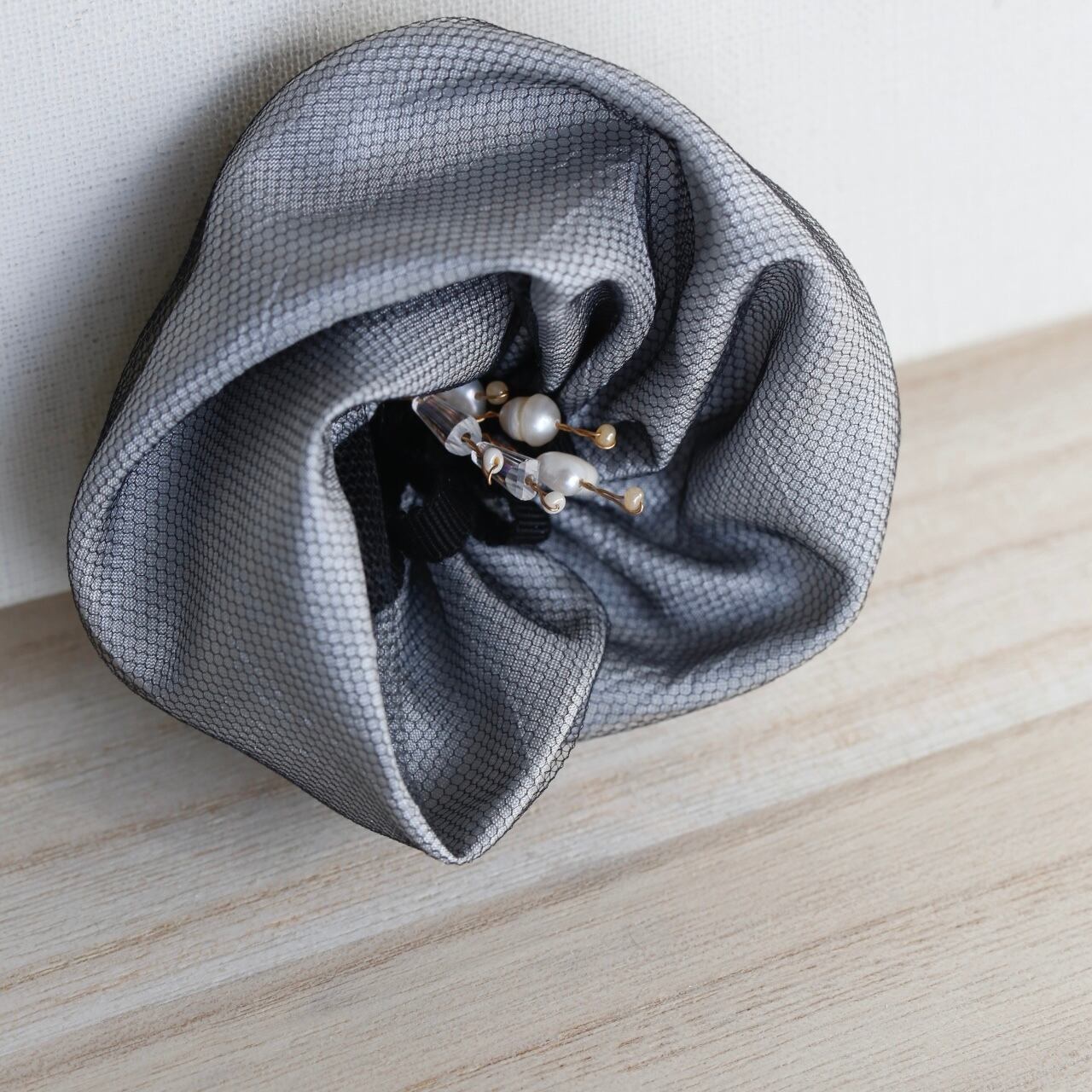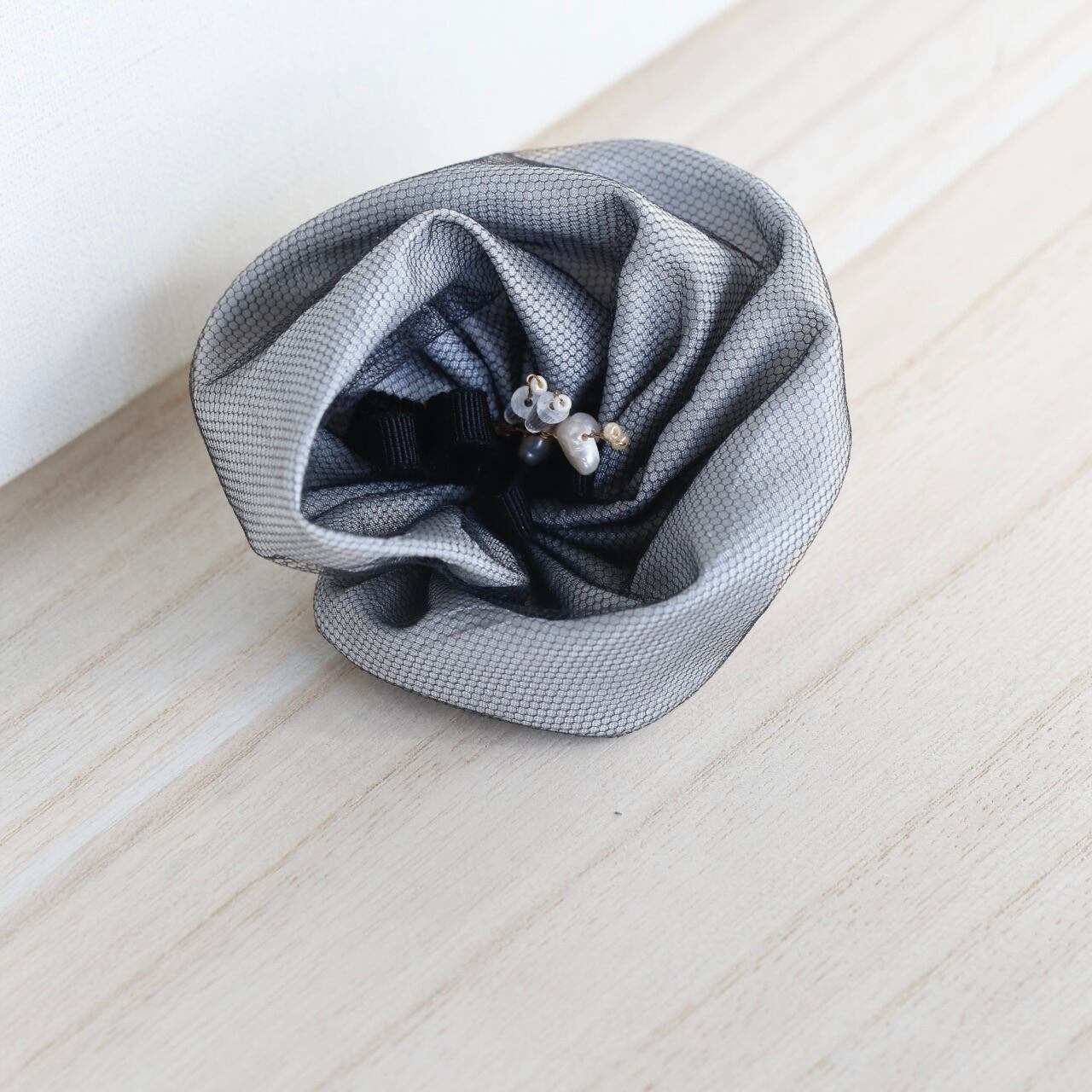 ライトグレーのサテン生地とオーガンジーを二枚重ねにし、バラの花びらに見立てて作ったローズコサージュ。