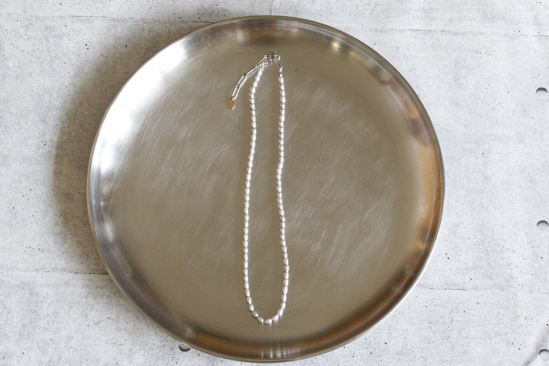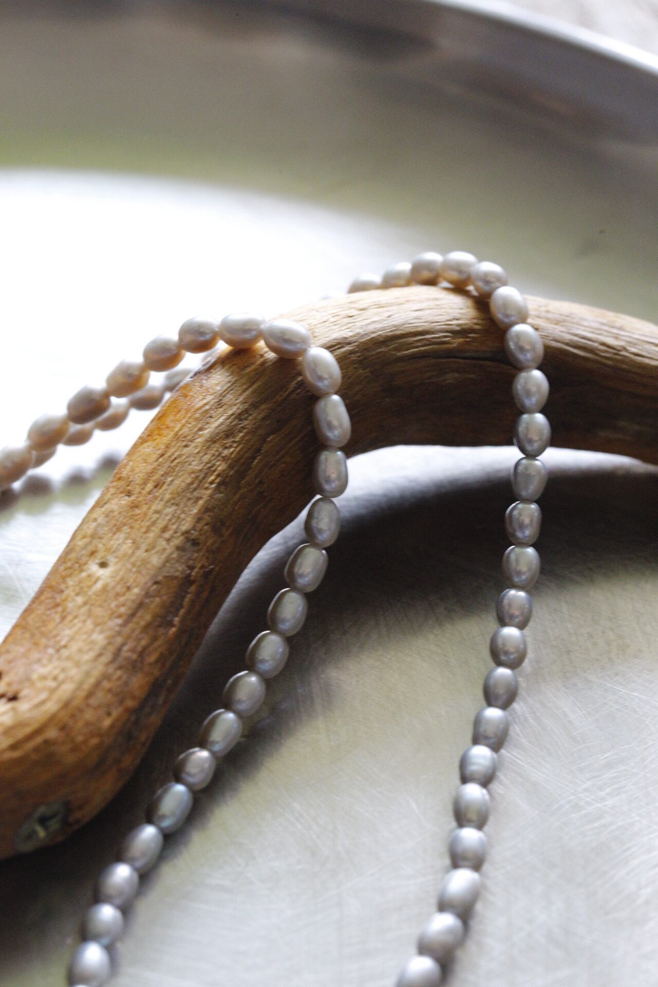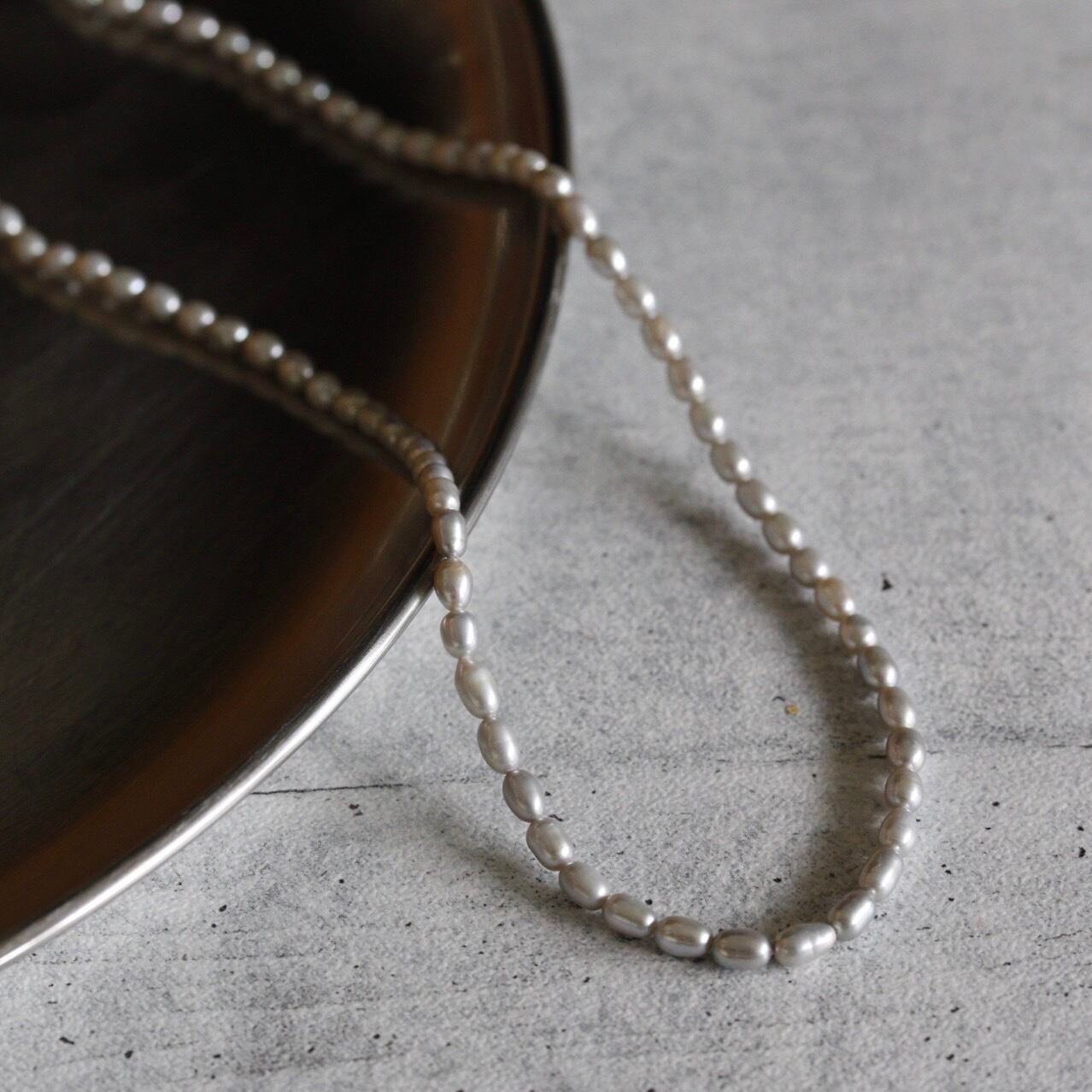 自然な輝きと整いすぎない粒が魅力の淡水パール!シルバーカラーのライスパールを繋げた、普段使いしやすいネックレス